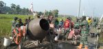 ini terlihat dilokasi TNI bersama-sama warga yang sedang berjibaku dengan pekerjaan pembangunan dilokasi jalan desa di Desa Tamansari.