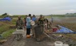 Begitu terdengar suara deru mesin molen, tampak semua orang bergegas menghampiri sumber suara. Mereka memegang ember dan cangkul sembari mengisi embernya dengan penuh pasir dan koral kemudian dimasukkannya ke dalam Tungku mesin molen yang dinyalakan.