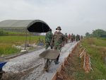 Sementara itu, dilokasi pekerjaan tampak sibuk anggota satgas TMMD hilir mudik, mendorong angkong yang melangsir cor beton yang akan digelar pada tempat yang sudah disiapkan.