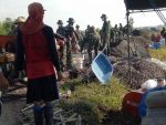 Nampak semangat anggota Satgas TMMD dan masyarakat yang turut serta dalam pengecoran jalan sedang bergelut untuk mengantri adonan cor dari mesin pengaduk semen. Mereka mengantri adonan cor untuk di langsir menuju tempat pengecoran jalan dengan membawa angkong dan ada juga yang memakai ember bekas cat.