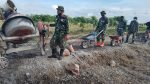 SULUTDAIL//Pati – Satgas TMMD Reguler Ke-111 TA. 2021 Kodim 0718/ Pati, melaksanakan gotong royong pengecoran jalan bersama masyarakat di Desa Tamansari,Kecamatan Jaken, Kabupaten Pati, Antrian panjang terjadi saat mesin molen mulai memasukan material campuran cor yang siap untuk di olah lalu di angkut dengan kendaraan angkong (kereta dorong) untuk ditumpahkan kejalan yang menjadi sasaran pengecoran. Minggu (27/06/21).