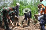 Letkol Inf Irwansah S.A.P berbaur dengan warga talun untuk memindahkan material agar tidak menghalangi truk yang masuk membawa material.