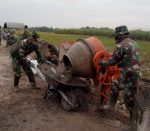 Terlihat mahir Pelda Mardiyono dibantu satu orang lainnya menyediakan adonan pasir bercampur semen yang nantinya akan digunakan sebagai bahan utama betonisasi jalan yang membentang sepanjang 1450 meter.Kamis,(17/06/2021).