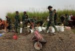Seperti terlihat puluhan ember berwarna putih ikut berbaris bersama TNI Satgas TMMD yang sedang melangsir bahan material untuk keperluan pengecoran, agar proses pengadukan material cor tidak berhenti, Minggu (20/6/2021).