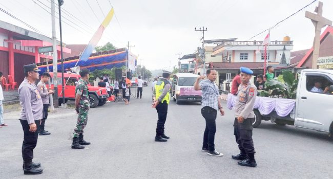 SULUTDAILY|| Ratahan – Kepolisian Resor (Polres) Minahasa Tenggara (Mitra) dibawah nahkoda Kapolres AKBP Eko Sisbiantoro, berkolaborasi dengan pihak TNI dari Koramil Tombatu melakukan pengamanan kegiatan ibadah dan pawai Paskah GPdI Wilayah 82 Tombatu, Sabtu (29/4/2023).