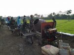 Nampak seorang personil TNI bersama warga bahu membahu gotong-royong dalam pengerjaan pembangunan pengecoran jalan dengan mengangkut Adukan cor menggunakan alat bantu gebobak dorong.