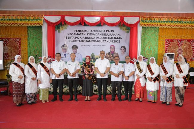 SULUTDAILY || Kotamobagu – Bunda PAUD Kota Kotamobagu, Ny. Rindah Gaib Mokoginta, S.E., M.Ec.Dev., secara resmi mengukuhkan Bunda PAUD tingkat Kecamatan, Desa, dan Kelurahan, serta Kelompok Kerja (Pokja) Bunda PAUD Kecamatan se-Kota Kotamobagu. Kegiatan pengukuhan berlangsung di Aula Rumah Dinas Wali Kota Kotamobagu, Rabu (8/10/2025).
