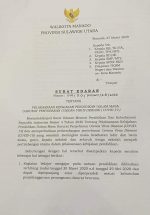 Surat edaran benomor 044/D.01/DIKBUD/218/2020 tertanggal 27 Maret 2020 tentang Pelaksanaan Kebijakan Pendidikan Dalam Masa Darurat Penyebaran Covid-19, ditujukan kepada para kepala sekolah di Kota Manado.