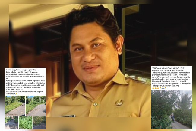 “Yth. Bupati Mitra Ronald Kandoli, mohon jalan Mundung–Tonsawang–Moreah dibersihkan karena sudah sempit dan tertutup rumput. Sangat membahayakan pengguna jalan,” tulisnya.