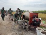 Anggota TNI dari Kodim 0718/pati ini seolah tidak ragu dengan apa yang dia kerjakan. Dia bekerja dengan mantap mendorong gerobak ruda satu itu untuk sampai ke lokasi penghamparan adukan. Sesampainya dilokasi kemudian dia tuangkan adukan yang dibawanya.