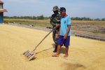 Seperti terlihat kali ini, Serda Sukarji anggota Satgas TMMD Reguler ke-111 Kodim 0718/Pati sedang membantu Bapak Karsono dalam kegiatan menjemur gabah hasil panennya. Mereka terlihat sedang menggelar gabah di lahan tanah kosong tidak jauh dari rumahnya. Karena cuaca hari ini sementara sedikit cerah, Selasa (13/7/2021) yang lalu.