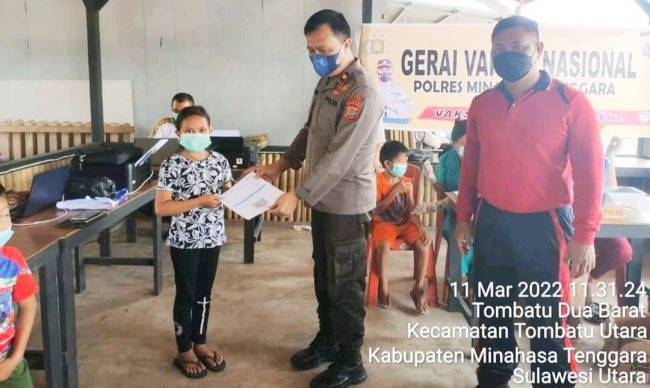 SULUTDAILY|| Ratahan – Gerai Vaksinasi Nasional Kepolisian Resort Minahasa Tenggara (Polres Mitra) terus diintensifkan. Jumat, 11 Maret 2022 kemarin, tim vaksinasi presisi Polres Mitra kembali memberikan pelayanan vaksinasi dosis 1, 2 dan dosis booster di Desa Tombatu Dua Barat.