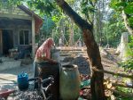 Tampak terlihat seorang ibu-ibu menyiapkan air kedalam tempat penampungan air yang akan digunakan untuk mengaduk semen. Ia membantu bapak-bapaknya untuk merenovasi rumah warga yang mendapatkan bantuan Rehab RTLH di program TMMD.