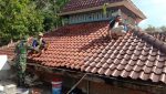 Terlihat dilokasi anggota TNI satgas TMMD sedang berjibaku dalam kegiatan pengecatan genteng masjid. Bersama-sama dengan warga desa mereka berupaya sesegera mungkin mengentaskan pengecatan gentengnya.