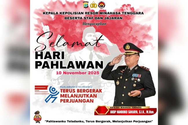 SULUTDAILY|| Ratahan – Kapolres Minahasa Tenggara (Mitra) AKBP Handoko Sanjaya, bersama seluruh staf dan jajaran mengucapkan Selamat Hari Pahlawan 10 November 2025.