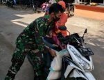 SULUTDAILY//Pati – Ibu Suyatmi (51) warga Dukuh Kemiri RT.02/03, Desa Tamansari, Kecamatan Jaken, Kabupaten Pati, terlat sedang dibantu Serda Sukarji anggota Satgas TMMD Reguler ke-111 Kodim 0718/Pati, menaikkan 2 karung beras ke atas motor metiknya, Minggu (11/7/2021)