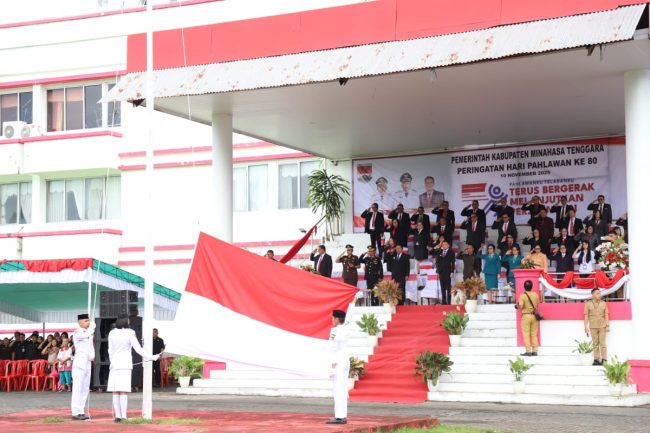 PEMERINTAH Kabupaten Minahasa Tenggara (Mitra) menggelar upacara peringatan Hari Pahlawan ke-80 Tahun 2025 dengan penuh khidmat di Lapangan Kantor DPRD Mitra, Senin (10/11/2025). Bertindak sebagai Inspektur Upacara (Irup), Bupati Minahasa Tenggara Ronald Kandoli memimpin langsung jalannya upacara yang mengusung tema nasional “Pahlawanku Teladanku: Terus Bergerak, Melanjutkan Perjuangan.”