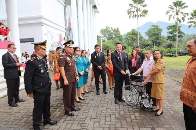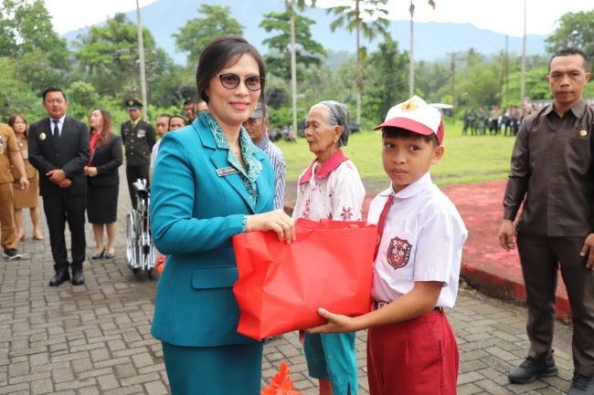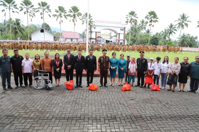 Sebagai wujud nyata kepedulian sosial, rangkaian peringatan Hari Pahlawan juga diisi dengan penyerahan bantuan sosial kepada masyarakat. Bupati Ronald Kandoli bersama Ketua TP-PKK Ny. Stefa Kandoli Antou, Wakil Bupati Fredy Tuda, serta jajaran Forkopimda menyerahkan secara simbolis paket sembako untuk penyandang disabilitas dan lansia, kursi roda, serta seragam sekolah bagi siswa SD dan SMP.