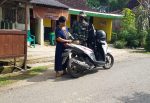Terlihat Serda Sukarji anggota Satgas TMMD sedang membeli bensin eceran di kios Ibu Endang (36) warga Dukuh Kemiri, Desa Tamansari, Kecamatan Jaken, Kabupaten Pati, karena motor yang biasa dikendarai untuk transportasi ke sasaran fisik TMMD macet kehabisan bensin, Jum’at (02/7/2021).