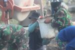 Dalam potret kebersamaan tersebut terlihat seorang anggota satgas sedang membantu warga mengangkat pasir yang akan dimasukkan kedalam mesin molen pengaduk adonan beton.Minggu,(27/06/2021).