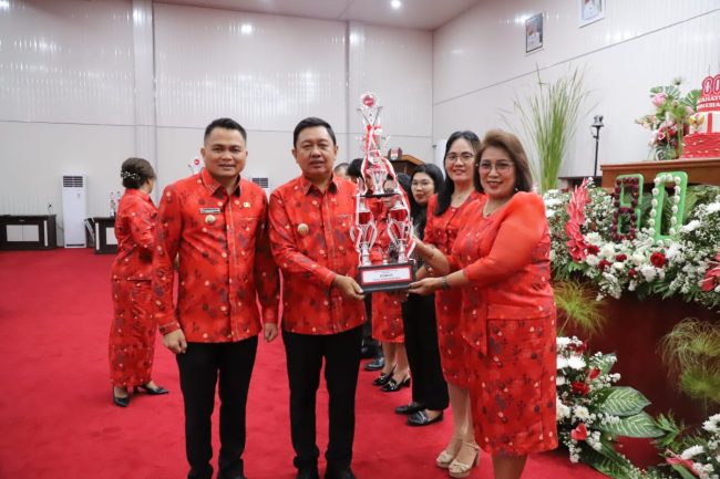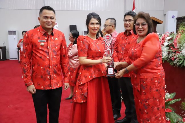 Ketua TP-PPK Mitra Ny. Steva Kandoli Antou bersama Bupati Ronald Kandoli menyerahkan hadiah kepada Kadis Kominfo Silfia Makaenas.