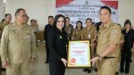 Walikota Tomohon Jimmy Feidie Eman SE Ak CA menyerahkan penghargaan ini kepada Wakil Walikota Syerly Adelyn Sompotan, Sekda Tomohon Ir H V Lolowang MSc MTh, Inspektur Kota Tomohon Max M Mentu SIP MAP, Kepala BLPSDM Drs Daniel Pontonuwu.