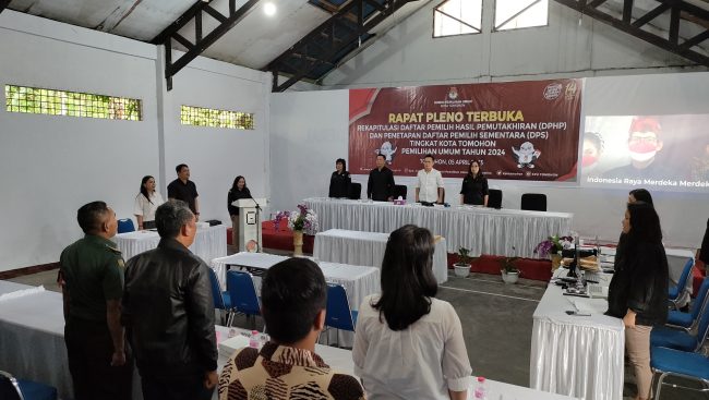SULUTDAILY|| Tomohon – Komisi Pemilihan Umum (KPU) Kota Tomohon menggelar Rapat Pleno Terbuka Rekapitulasi Daftar Pemilih Hasil Pemutahiran (DPHD) dan Penetapan Daftar Pemilih Sementara (DPS) Tingkat Kota Tomohon Pemilihan Umum Tahun 2024, (5/4/2023) di Aula KPU Tomohon.