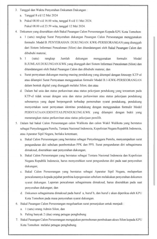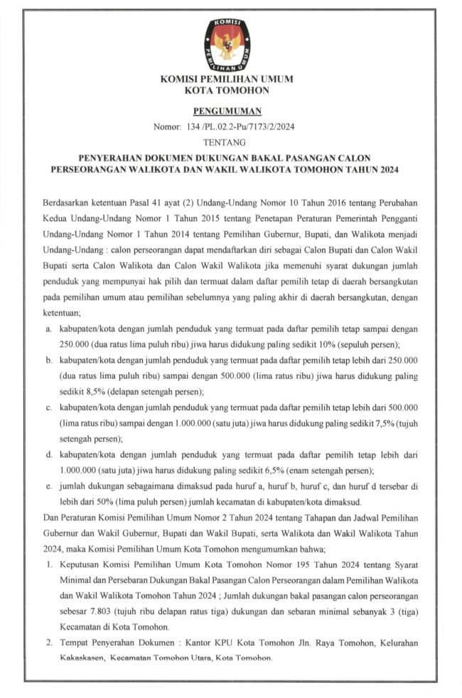 SULUTDAILY|| Tomohon – Komisi Pemilihan Umum (KPU) Kota Tomohon secara resmi mengumumkan Surat Keputusan be-Nomor: 134/PL.02.2-Pu/7 173/2/2024 Tentang Penyerahan Dokumen Dukungan Bakal Pasangan Calon Perseorangan Walikota dan Wakil Walikota Tomohon Tahun 2024 yang ditandatangani Ketua KPU Kota Tomohon Albertien V Pijoh.