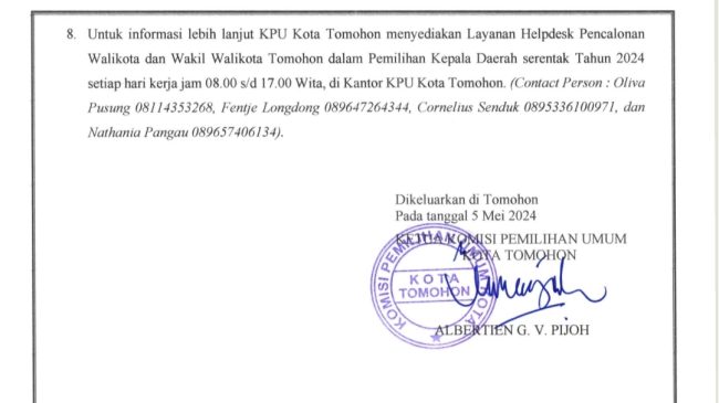 Untuk informasi lebih lanjut KPU Kota Tomohon menyediakan Layanan Helpdesk Pencalonan Walikota dan Wakil Walikota Tomohon dalam Pemilihan Kepala Daerah serentak Tahun 2024 setiap hari kerja jam 08.00 s/d 17.00 Wita, di Kantor KPU Kota Tomohon. (Contact Person : Oliva