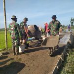 Anggota TNI satuan tugas TMMD Reg-111 Kodim 0718/Pati dan warga yang sedang berjibaku dalam program Betonisasi jalan penghubung antar dua desa, Desa Tamansari dan Desa Sumberagung yang mana jalan tersebut memanjang melewati persawahan.