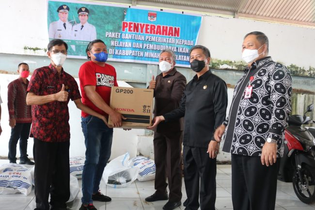 SulutDaily || Minsel – Bupati Minahasa Selatan (Minsel) Franky Donny Wongkar, SH., dan Wakil Bupati Pdt. Petra Yani Rembang, menyerahkan Bantuan Kendaraan Roda Dua/Motor kepada Pendamping PKH serta Bantuan Perahu, Bibit Ikan Nila dan Pakan untuk Kelompok Nelayan , turut hadir Sekretaris Daerah Minsel Denny P. Kaawoan, SE., M.Si., Kadis Sosial Sofie Sumampow, S.Pd., M.Si., berserta Jajaran, serta Kadis Kelautan dan Perikanan Ir. Alexander Sonambela, M.Si Kamis 30/12/2021