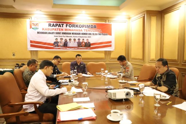 SULUTDAILY|| Ratahan – Bupati Minahasa Tenggara Ronald Kandoli memimpin langsung Rapat Forum Koordinasi Pimpinan Daerah (Forkopimda) yang digelar untuk membahas langkah antisipasi terhadap potensi dampak aksi unjuk rasa, serta pencegahan provokasi, hoaks, dan ujaran kebencian yang bisa memicu konflik sosial.