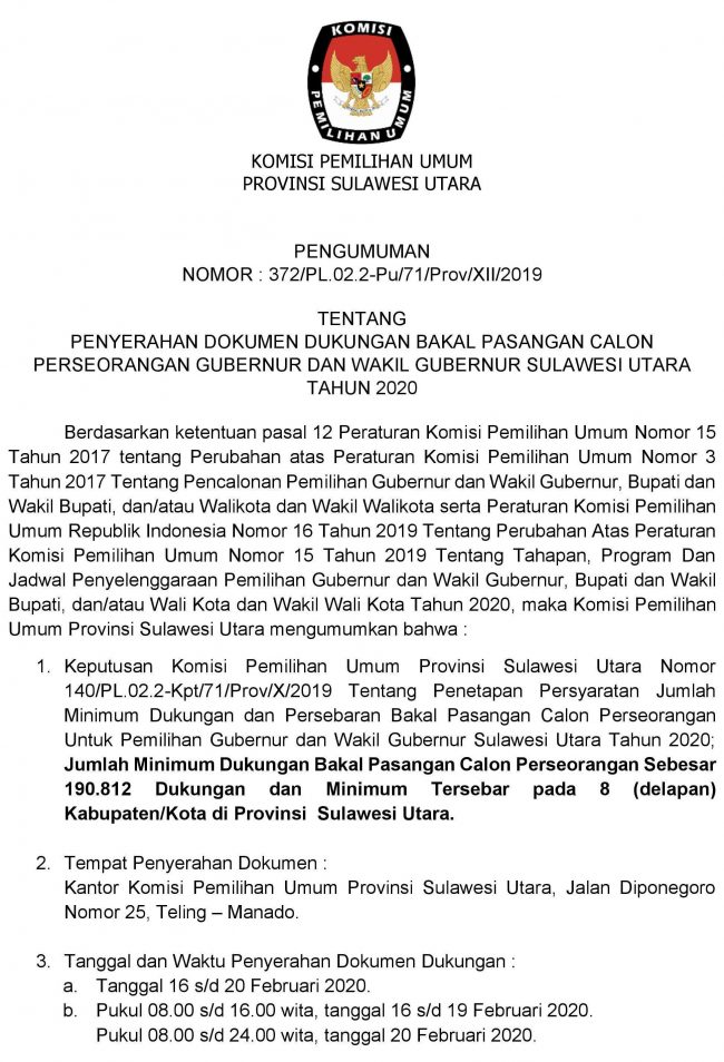 HomeAdvertorialPengumuman Tentang Penyerahan Dokumen Dukungan Bakal Pasangan Calon Perseorangan Gubernur Dan Wakil Gubernur Sulawesi Utara Tahun 2020 Admin8 December 2019 3:27 PM SULUTDAILY||Manado – CATEGORIES Advertorial Share ThisAUTHORAdmin