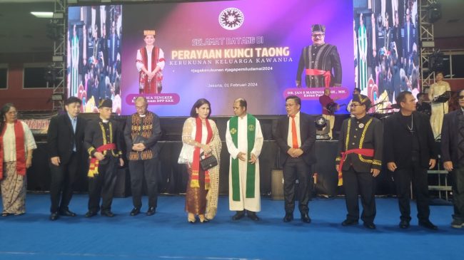 SULUTDAILY|| Jakarta, – Sore itu Jakarta diguyur hujan namun ratusan warga Kawanua di Jabodetabek hadir dalam perayaan Kunci Taong DPP Kerukunan Keluarga Kawanua (KKK) berlangsung meriah di GOR Soemantri Brodjonegoro, Basketball Hall, GOR Soemantri Brodjonegoro, Jakarta Selatan, pada Kamis (1/2/2024) malam.
