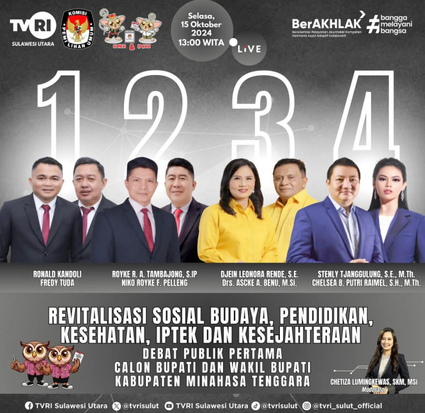 SULUTDAILY|| Ratahan – Komisi Pemilihan Umum (KPU) Kabupaten Minahasa Tenggara (Mitra), menyelenggarakan debat publik pertama Pasangan Calon (Paslon) Bupati dan Wakil Bupati pemilihan kepala daerah (Pilada) tahun 2024, Selasa (15/10/2024).