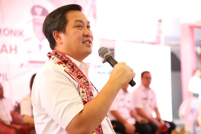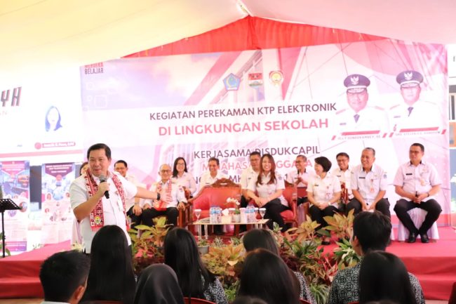 SULUTDAILY|| Ratahan – Wakil Gubernur Sulawesi Utara Steven Kandouw didampingi Pj. Bupati Minahasa Tenggara Ronald Sorongan, menyerahkan KTP-e kepada siswa siswi SMA dan SMK se-Mitra, Rabu (15/11/2023) bertempat di SMK Negeri 1 Ratahan.
