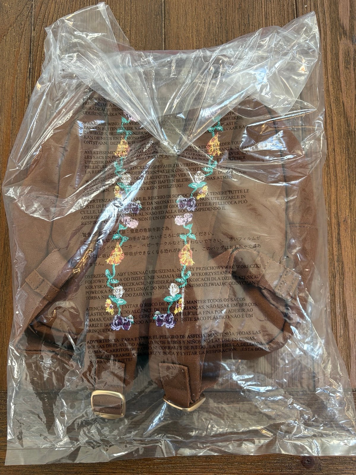 Brown canvas mini backpack with front zip pocket and top zip opening with adjustable straps, top handle and gold tone zipper pull and hardware. "TS" logo embroidered on front with acoustic piano flower design embroidered on front and straps. Never opened.