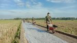 SULUTDAILY//Pati – Pekerjaan terberat di lokasi pengecoran jalan 1.450 meter lebar 2,6 meter di TMMD Reguler Ke-111 Kodim 0718/Pati di Desa Tamansari, Kecamatan Jaken, Kabupaten Pati, Jawa Tengah, adalah saat langsir adonan cor.