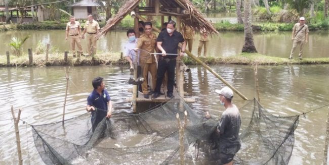 Kepala Dinas Perikanan dan Kelautan (DKP) Mitra Budi Raranta bersama jajarannya secara langsung menghadiri kegiatan panen perdana budidaya ikan nila dari Pokdakan Molingkawok Towuntu Barat.