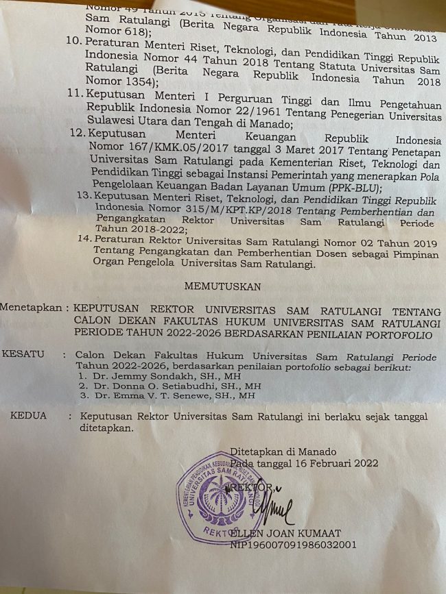 SULUTDAILY|| Manado – Rektor Universitas Sam Ratulangi Prof. Dr. Ir. Ellen Joan Kumaat M.Sc DEA melalui SK Nomor 326/UN12/KP/2022 tertanggal 16 Pebruari 2022 menetapkan 3 (tiga) calon Dekan Fakultas Hukum Unsrat Manado setelah penjaringan 7 bakal calon.