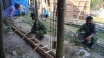 Dua orang anggota satgas TMMD terlihat sedang sibuk membantu menyiapkan pengecoran pondasi dengan menata papan cor yang berasal dari papan randu yang sudah siap menopang adonan semen, pasir dank oral yang sudah dipersiapkan oleh tukang.