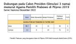 Sementara itu, pada 2019, ada 98,7 persen pemilih Prabowo di Pilpres 2019 yang berlatar belakang Islam dan yang tidak beragama Islam sebesar 1,3 persen. Dari pemilih Prabowo yang beragama Islam, sekarang terdistribusi pada Anies 45 persen, Ganjar 13 persen, dan Prabowo 36 persen. Masih ada 6 persen yang belum menjawab. Sementara dari pemilih Prabowo 2019 yang beragama selain Islam, sekarang memilih Anies 0 persen, Ganjar 14 persen, dan Prabowo 75 persen. Ada 11 persen yang belum menjawab.