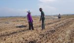 Terlihat Serda Sukarji anggota Satgas TMMD Reguler Kodim Pati sedang membantu Ibu Sarmini (46) warga Dukuh Kalimati, Desa Tamansari, Kecamatan Jaken, Kabupaten Pati, meratakan bekas potongan jerami. Lahan milik Sarmini rencana akan ditanami palawija jenis kacang hijau.