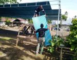 Para anggota satgas mengangkut satu demi satu perlengkapan dan merangkainya dengan cekatan. Bangsal tersebut akan digunakan untuk ibadah yang diadakan warga pemilik rumah.