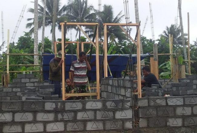 Para satgas TMMD bersama masyarakat bergotong royong melanjutkan betonisasi jalan.