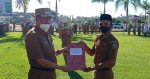 Sekertaris Daerah Dr. Drs. Asripan Nani, M.Si yang menyerahkan langsung simbolis penyaluran tahap 1 (satu) 60 persen ADD tahun 2021 kepada 6 sangadi yang menjadi perwakilan dimasing – masing kecamatan, Senin (22/03/2021).