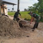 Terlihat dilokasi dua anggota satgas TMMD sedang bekerja sama dalam mengangkut material pasir, yang nantinya akan dibawa ke depan halaman Mushola Nurul Iman Desa Tamansari. Yang satu bertugas memegang angkong, satunya lagi bertugas untuk pengisian pasir ke dalam bak angkong.