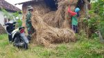 Seperti terlihat Rusdi (46) warga Dukuh Pandahan RT.03/03, Desa Tamansari, Kecamatan Jaken, Kabupaten Pati, dengan dibantu Serda Sukarji anggota Satgas TMMD Reguler ke-111 Kodim Pati, sedang menumpuk jerami kering disebuah bangunan rumah kecil, Senin (21/6/2021)