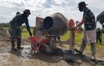 Seperti terlihat Koptu Sambas sedang memuntahkan adukan cor dari mulut molen ke angkong yang diawaki Sertu Imron yang selalu tampil modis di lokasi pengecoran. Meraka adalah pasangan setia selama pelaksanaan kegiatan pengecoran jalan pertanian sasaran fisik TMMD, Selasa (29/6/2021).