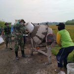 Ditengah cuaca yang sudah mulai panas karena matahari sudah mulai meninggi, anggota TNI yang mendapatkan tugas dalam penyiapan material adukan terlihat silih berganti memasukkan material-material adukan seperti semen, pasir, koral kedalam tungku pembuat adukan pada mesin molen.